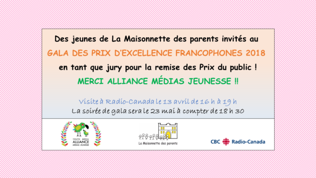 L’Alliance Médias Jeunesse (AMJ) prépare les Prix d’excellence francophones 2018, qui récompenseront les productions jeunesses (télévisuelles et interactives) les plus remarquables des deux dernières années, lors d’un gala qui aura lieu le 23 mai 2018 à la Maison de Radio-Canada. Nous avons le plaisir d’annoncer que l’AMJ a invité 12 de nos jeunes, âgés entre 9 à 12 ans, à faire partie du jury…