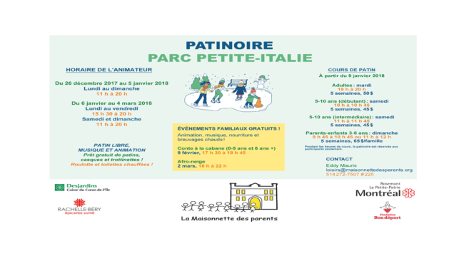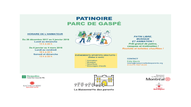 En plus de la patinoire du Parc Petite-Italie, c’est avec grande joie que nous annonçons l’ajout d’une autre patinoire du quartier : la patinoire du Parc de Gaspé ! Elle est située sur la rue de Gaspé, entre les rues Beaubien et Saint-Zotique, venez en profiter !