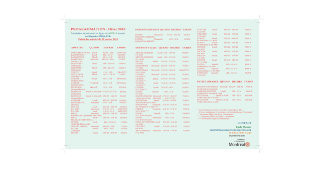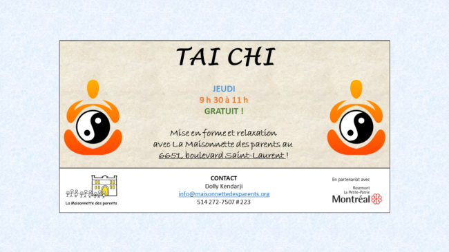 Venez profiter de séances de Tai Chi offertes gratuitement ! Il vous suffit simplement d’être membre de La Maisonnette des parents. La carte de membre au coût de 5 $ se fait sur place à notre organisme ou en ligne via la plateforme Amilia. De plus, la carte est valable pour toutes nos activités !
