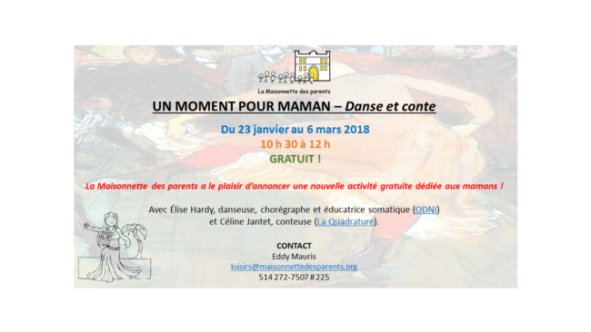 La Maisonnette des parents a le plaisir d’annoncer une nouvelle activité gratuite dédiée aux mamans ! Des ateliers de danse et de parole qui ont été pensés pour vous, pour vous accompagner dans votre maternité. Pour se réapproprier son corps et partager ses expériences. Faites-vous plaisir sans culpabiliser !