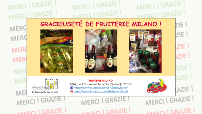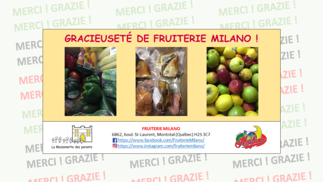 Voici un aperçu des dons alimentaires reçus cette semaine de Fruiterie Milano 🙂 Au nom de La Maisonnette des parents et nos familles, GRAZIE !