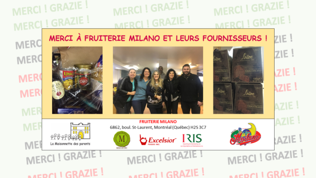 Cette semaine, nous avons eu la grande visite de Mme Zaurrini de Fruiterie Milano qui nous a aidés à préparer des paniers de Noël 🙂 Voici une photo de notre équipe en sa compagnie 🙂 De plus, voici un aperçu des dons alimentaires reçus cette semaine ! Nous tenons à remercier Fruiterie Milano et leurs…