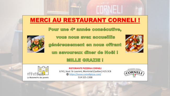 Pour une quatrième année consécutive, notre dîner de Noël, chapeauté par la Famille Corneli, fut un franc succès ! Nous tenons à remercier le Restaurant Corneli et son équipe d’avoir ouvert leurs portes gratuitement aux familles de La Maisonnette des parents 🙂Leur délicieuse cuisine italienne et chaleureuse ambiance ont rendu plusieurs enfants et parents heureux en ce temps des…