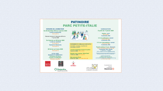 Venez profiter de la magnifique patinoire du parc Petite-Italie située sur le boulevard Saint-Laurent (coin Saint-Zotique), directement en face de La Maisonnette des parents ! Voici un lien afin de visualiser d’avantage les horaires des activités de patinage : PATINOIRE PARC PETITE-ITALIE. Nous tenons à remercier nos partenaires financiers la Caisse Desjardins du Cœur-de-l’Île ainsi que l’arrondissement Rosemont–La…