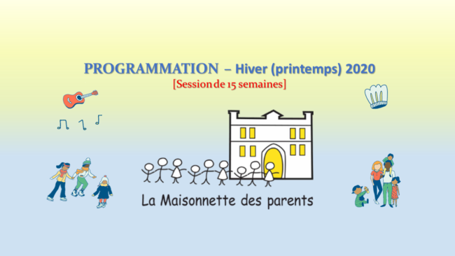 Nous avons le plaisir de vous présenter notre programmation d’activités pour la session d’hiver (printemps) 2020 🙂 [leap_icon_box layout= »icon-with-title » backgroundcolor= » » iconimage= » » iconimagewidth= » » iconimageheight= » » title= »Veuillez cliquer sur le bouton ci-dessous : » titlecolor= »blue » circle= »yes » circlecolor= » » circlebordercolor= » » icon= » » iconcolor= » » link= » » linkcolor= » » linktext= » » linktarget= » » animationtype= »flash » animationspeed= »5″ animationdelay= »1″ animationoffset= » » animationiteration= »13″ ][/leap_icon_box] [leap_button align= »left » size= » » type= »blue1″ link= »http://www.maisonnettedesparents.org/wp-content/uploads//2019/12/PROGRAMMATION-Activités-HIVER-2020-La-MDP_VF-CP.pdf » target= » » class= » » animationtype= » » animationspeed= » »…