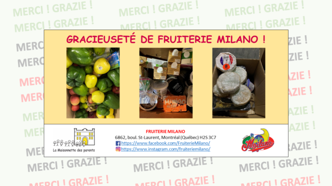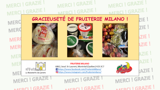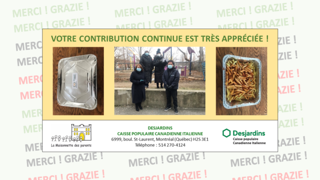 Pour une 3e fois, la Caisse Desjardins Canadienne Italienne, située au 6999, boulevard Saint-Laurent à Montréal, nous a remis des plateaux de pâtes alimentaires pour redistribuer à nos familles ! 🙂 Ce généreux don de 50 plateaux nous permettra de bonifier notre service alimentaire avec livraison, en fournissant davantage des plats à saveur italienne ! Voici une…