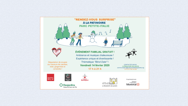 NOTRE ÉVÉNEMENT FAMILIAL GRATUIT « RENDEZ-VOUS SURPRISE » A LIEU DEMAIN ! VENEZ CÉLÉBRER LA SAINT-VALENTIN AVEC NOUS 🙂 Rendez-vous demain, le vendredi 14 février de 17 h à 21 h, en face de notre organisme (6651, boul. St-Laurent), à la patinoire du parc Petite-Italie ! Au plaisir de vous y voir 🙂   La Maisonnette des parents…