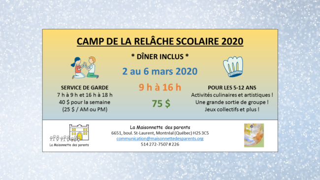 La période d’inscription est amorcée ! Profitez-en pour réserver votre place ! Programmation complète et inscriptions en ligne ici : Boutique en lignepowered by Amilia.com   La semaine de relâche arrive à grands pas et La Maisonnette des parents vous propose son fameux camp de jour pour vos enfants âgés de 5 à 12 ans…