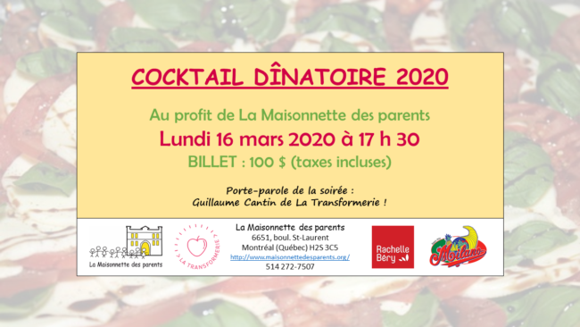 Nous avons le grand plaisir d’annoncer que La Maisonnette des parents organise un Cocktail dînatoire le lundi 16 mars prochain, à partir de 17 h 30 ! L’événement aura lieu dans les locaux de notre organisme au 6651, boul. St-Laurent. Cette campagne de financement vise à amasser des fonds pour contribuer à notre mission communautaire…