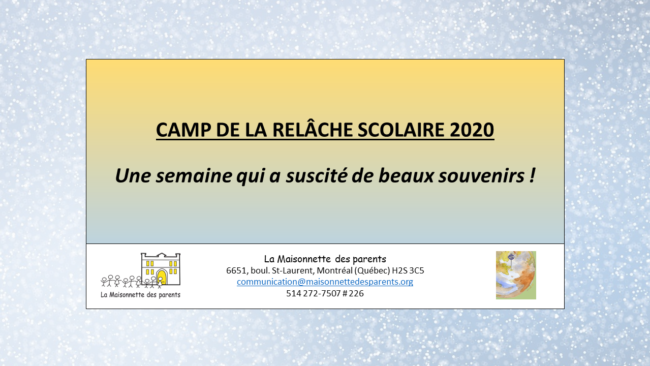 En cette période d’incertitude, voici une publication qui vous rappellera la joie de vivre ! Il nous fait plaisir de partager avec vous des souvenirs de notre Camp de la relâche scolaire 2020 🙂 Ci-dessous est un petit montage photo animé de certains beaux moments de notre camp. Merci à notre formidable équipe d’animatrices et…