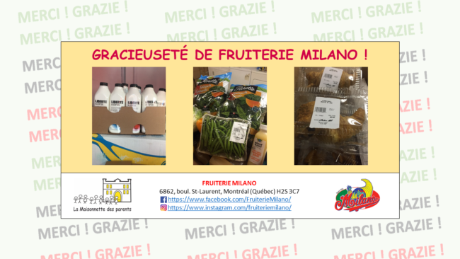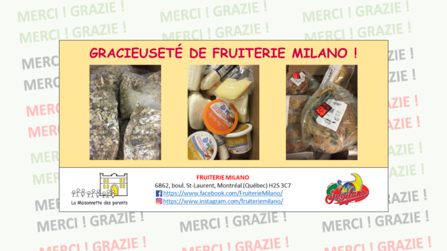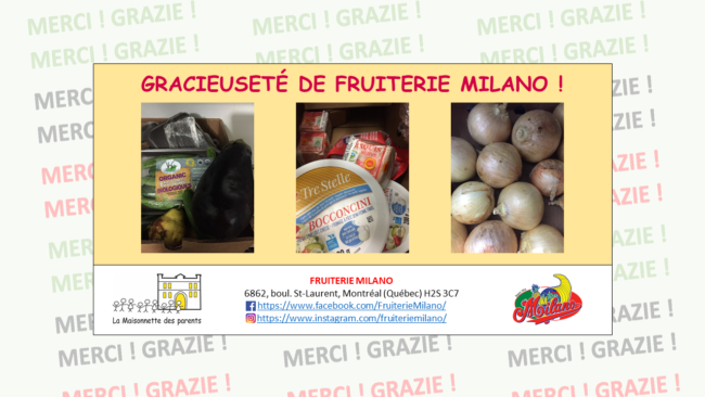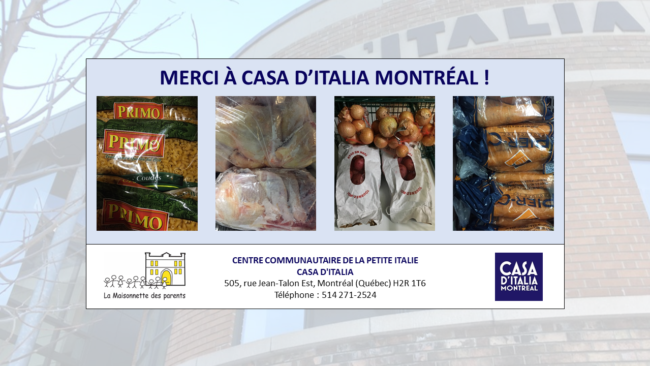 Voilà qu’une autre ressource du quartier se joint à notre cause ! C’est avec une grande joie que nous vous annonçons la collaboration de Casa d’Italia Montréal, située au 505, rue Jean-Talon Est à Montréal, qui nous a gracieusement remis une variété de denrées alimentaires 🙂 Une fois de plus, cette généreuse contribution permettra de…
