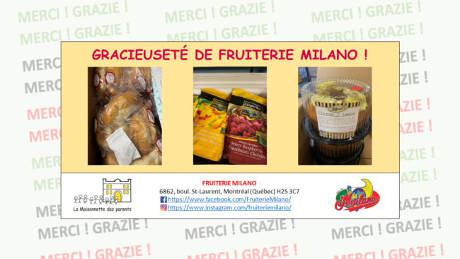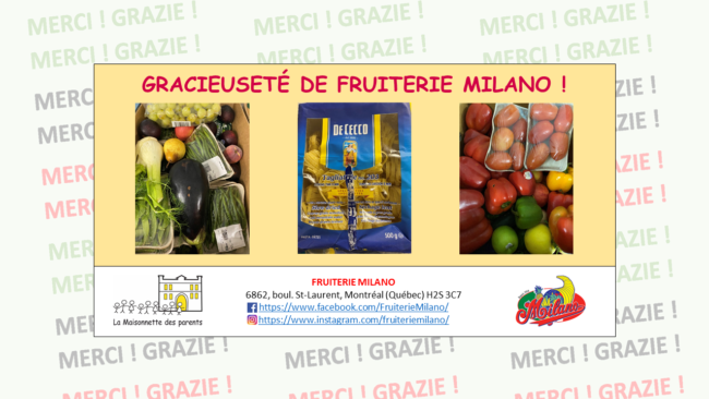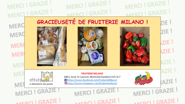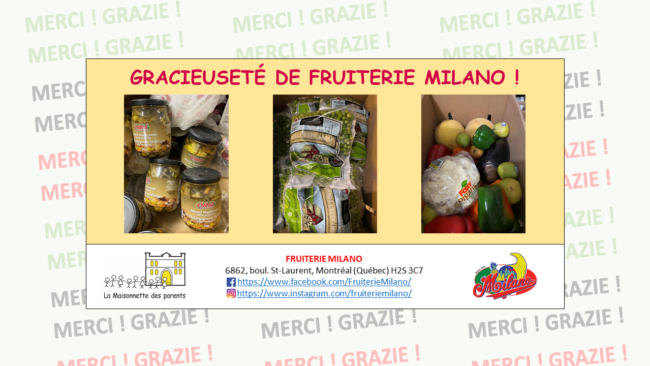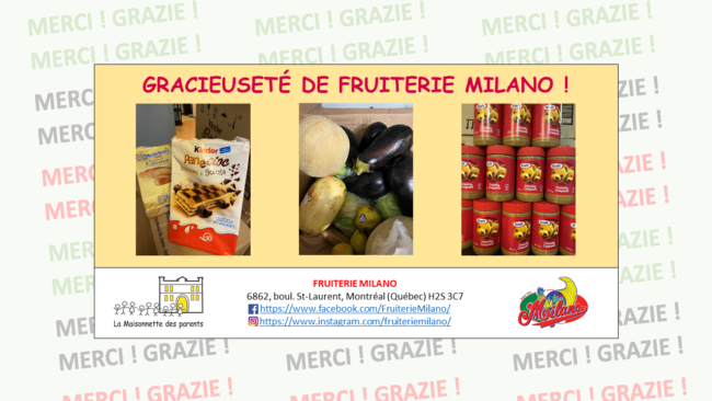 Voici un aperçu des dons alimentaires reçus cette semaine de Fruiterie Milano 🙂 Au nom de La Maisonnette des parents et nos familles, GRAZIE !