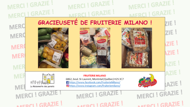 Voici un aperçu des dons alimentaires reçus cette semaine de Fruiterie Milano 🙂 Au nom de La Maisonnette des parents et nos familles, GRAZIE !