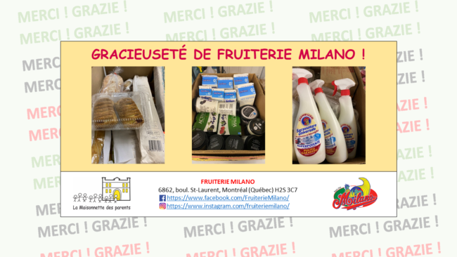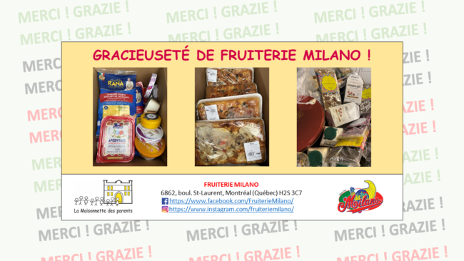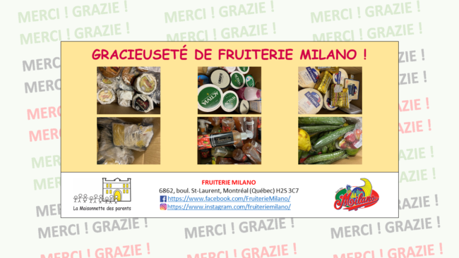 Voici un aperçu des dons alimentaires reçus cette semaine et la semaine dernière de Fruiterie Milano 🙂 Au nom de La Maisonnette des parents et nos familles, GRAZIE !