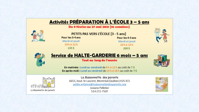 La présente est pour vous informer de notre offre de service concernant nos camps de jour pour l’année en cours. Pour ce qui est de notre Camp de la relâche scolaire 2021, il est malheureusement annulé. Sous toutes réserves, nous prévoyons offrir un Camp Parents-enfants 0-5 ans cet été ainsi qu’un Camp de jour 5-12…