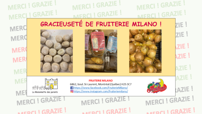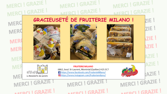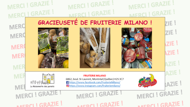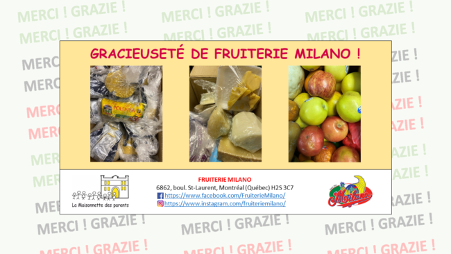 Voici un aperçu des dons alimentaires reçus cette semaine de Fruiterie Milano 🙂 Au nom de La Maisonnette des parents et nos familles, GRAZIE !