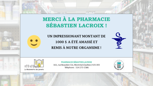 Il nous fait grandement plaisir de vous annoncer qu’encore une fois la Pharmacie Sébastien Lacroix, située dans notre quartier au 161, rue Beaubien Est à Montréal, a effectué une activité de financement pour notre organisme. 🙂 Un impressionnant montant de 1000 $ a été amassé et nous a été gracieusement remis ! 🙂 Nous remercions…