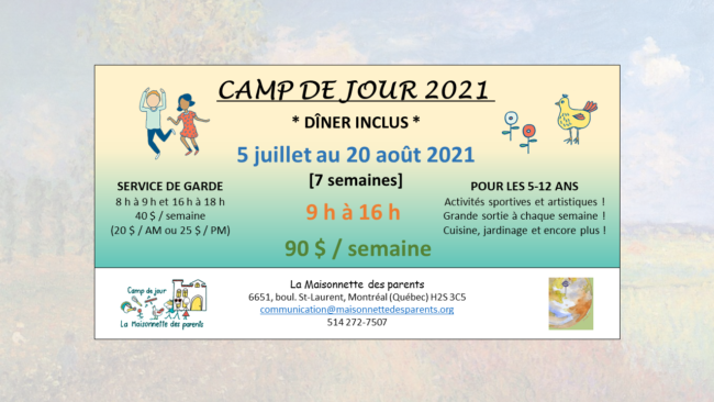 La période d’inscription est amorcée ! Profitez-en pour réserver votre place, car les places disponibles sont très limitées ! **Veuillez noter que le tarif indiqué lors de votre inscription au camp inclura une sortie hebdomadaire. Toutefois, si les directives gouvernementales nous interdisent de faire des sorties, un montant de 50 $ (du tarif régulier) vous sera crédité ou remboursé.…