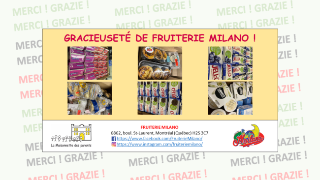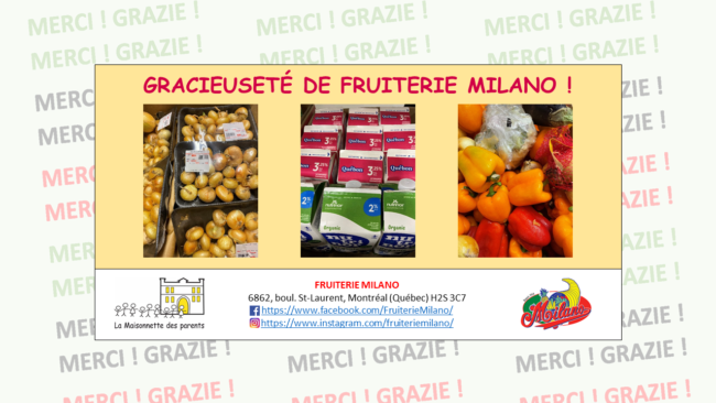Voici un aperçu des dons alimentaires reçus cette semaine, et la semaine dernière, de Fruiterie Milano 🙂 Au nom de La Maisonnette des parents et nos familles, GRAZIE !