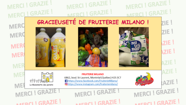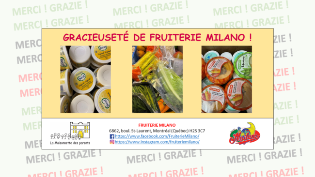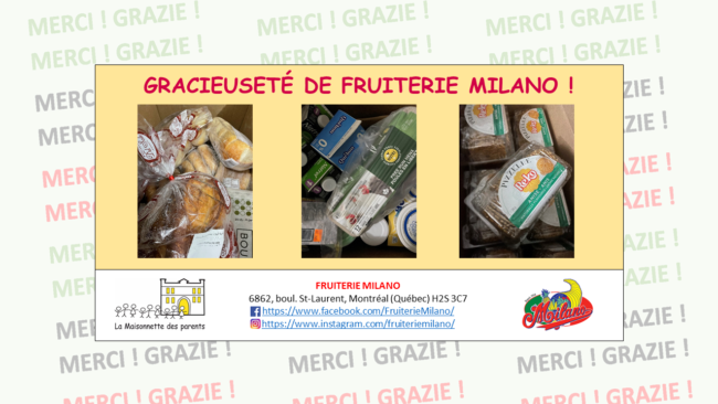 Voici un aperçu des dons alimentaires reçus cette semaine de Fruiterie Milano 🙂 Au nom de La Maisonnette des parents et nos familles, GRAZIE !