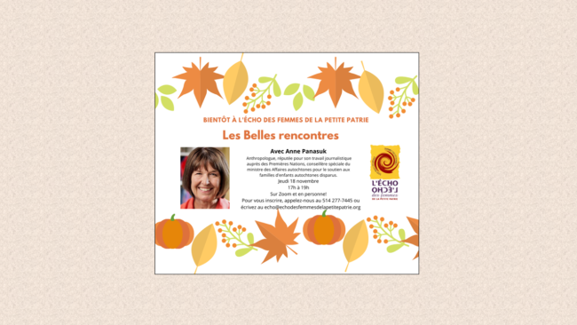Nous avons le plaisir de vous partager une nouvelle activité à venir, ainsi que la programmation complète, de L’Écho des femmes de La Petite-Patrie. Jeudi le 18 novembre prochain, l’organisme en question recevra, pour un 5 à 7, Anne Panasuk ; anthropologue, réputée pour son travail journalistique auprès des Premières Nations, et conseillère spéciale du…
