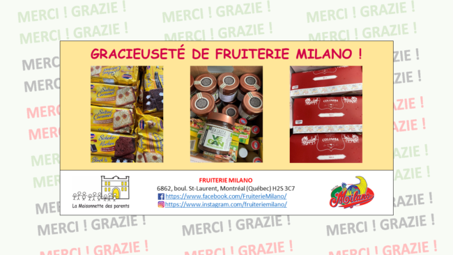 Voici un aperçu des dons alimentaires reçus cette semaine de Fruiterie Milano. 🙂 Au nom de La Maisonnette des parents et nos familles, GRAZIE !