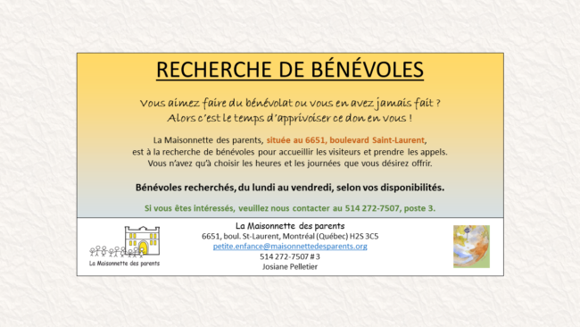 L’implication communautaire vous tient à cœur ? La Maisonnette des parents est l’endroit pour vous ! 🙂 Nous sommes à la recherche de bénévoles pour l’accueil, à la réception, de 9 h à 13 h, de 13 h à 17 h, ou toute la journée, et ce, du lundi au vendredi, selon vos disponibilités. 🙂…