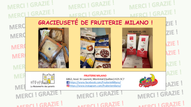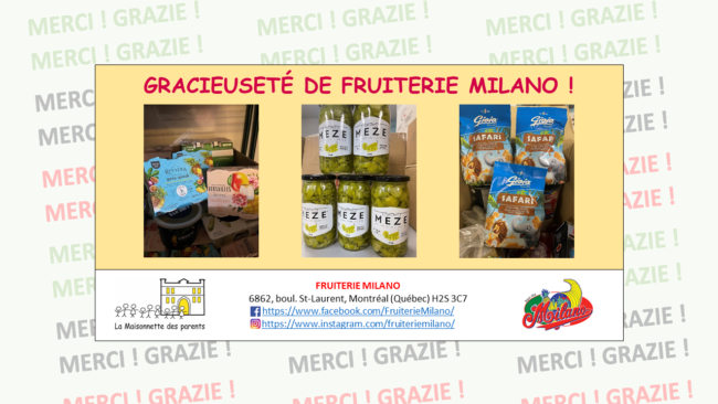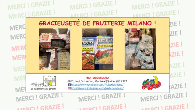 Voici un aperçu des dons alimentaires reçus la semaine dernière de Fruiterie Milano. 🙂 Au nom de La Maisonnette des parents et nos familles, GRAZIE !