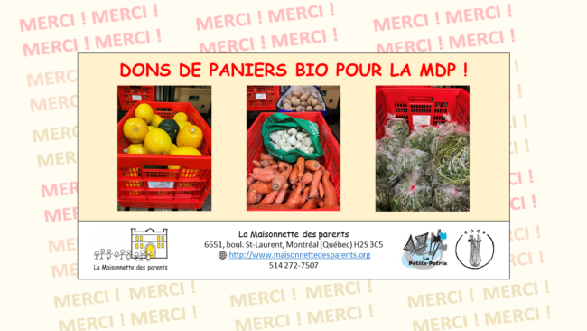 Nous tenons à remercier chaleureusement l’Organisme de participation des parents (OPP) de l’École La Petite-Patrie et la Coop de Solidarité des Jardins du Pied de Céleri de leur implication envers La Maisonnette des parents !! 🙂 Leur collaboration et générosité ont permis à notre organisme de bonifier notre service alimentaire grâce à leurs dons de paniers…