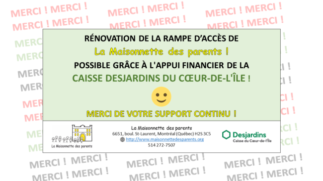 C’est avec grand bonheur que nous annonçons que notre rampe d’accès s’est faite une nouvelle peau, et ce, grâce à la contribution financière de notre partenaire la Caisse Desjardins du Cœur-de-l’Île. 🙂 Notre organisme communautaire Famille pourra s’assurer davantage d’accueillir en toute sécurité nos familles avec carrosses ainsi que nos usagers à mobilité réduite tout…