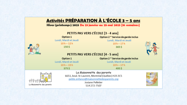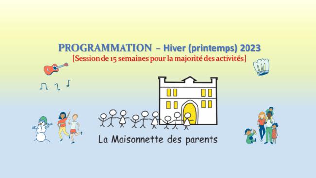 Nous avons le plaisir de vous rappeler que notre programme « Petits pas vers l’école 3-5 ans » est officiellement de retour, et c’est avec enthousiasme que nous annonçons le retour également de l’activité « Parents-enfants s’amusent 18 mois-3 ans » pour notre session d’hiver (printemps) 2023. 🙂 Ladite session est de 18 semaines, soit à partir de la…
