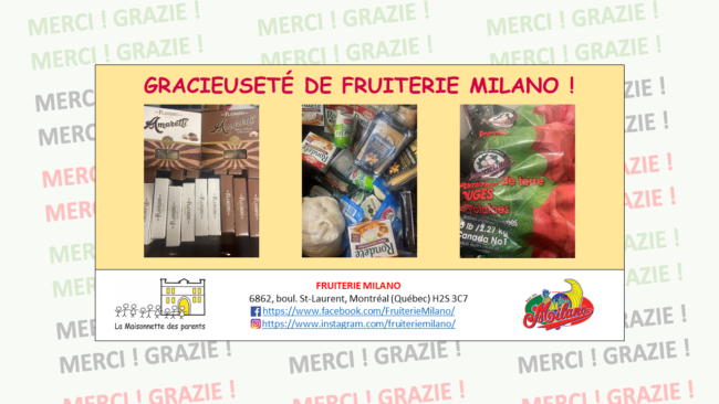 Voici un aperçu des dons alimentaires reçus des dernières semaines de Fruiterie Milano. 🙂 Au nom de La Maisonnette des parents et nos familles, GRAZIE !