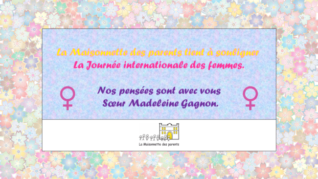 Dans le cadre de la Journée internationale des femmes, La Maisonnette des parents tient à saluer l’effort de toutes ces femmes qui se sont dévouées pour une cause, et particulièrement, notre fondatrice Sœur Madeleine Gagnon. 🙂 En cette journée du 8 mars, nous tenons donc à rappeler que par l’entremise de notre fondatrice, et l’organisme…
