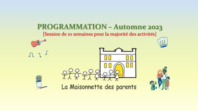 Nous avons le plaisir de vous présenter notre programmation d’activités pour la session d’automne ! 🙂 [leap_icon_box layout= »icon-with-title » backgroundcolor= » » iconimage= » » iconimagewidth= » » iconimageheight= » » title= »Veuillez cliquer sur le bouton ci-dessous : » titlecolor= »green » circle= »yes » circlecolor= » » circlebordercolor= » » icon= » » iconcolor= » » link= » » linkcolor= » » linktext= » » linktarget= » » animationtype= »flash » animationspeed= »5″ animationdelay= »1″ animationoffset= » » animationiteration= »13″ ][/leap_icon_box] [leap_button align= »left » size= » » type= »orange » link= »http://www.maisonnettedesparents.org/wp-content/uploads//2023/09/PROGRAMMATION_VF-Activités-AUTOMNE-2023-La-MDP-CP.pdf » target= » » class= » » animationtype= » » animationspeed= » » animationdelay= » »…