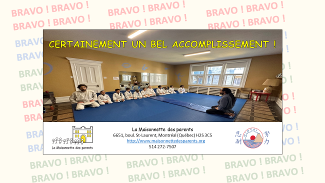 La Maisonnette des parents est très fière de souligner la persévérance de nos jeunes qui participent à notre activité d’arts martiaux Nintai Aiki Ju-Jitsu ! 🙂 D’ailleurs, le mot Nintai signifie persévérance en japonais, et en voici la preuve ! Cela fait maintenant cinq sessions consécutives que notre organisme communautaire Famille offre des cours d’arts…