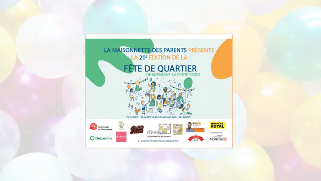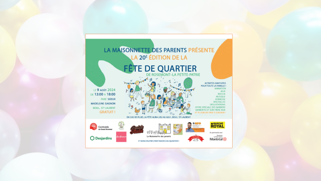 C’est avec grand plaisir que nous annonçons la tenue de la traditionnelle Fête de quartier de La Maisonnette des parents ! 🙂 L’événement aura lieu ce vendredi, le 9 août, de 13 h à 18 h, dans le Parc Sœur-Madeleine-Gagnon. 🙂 Comme l’été dernier, la Fête se déroulera pendant la période où notre Camp de…