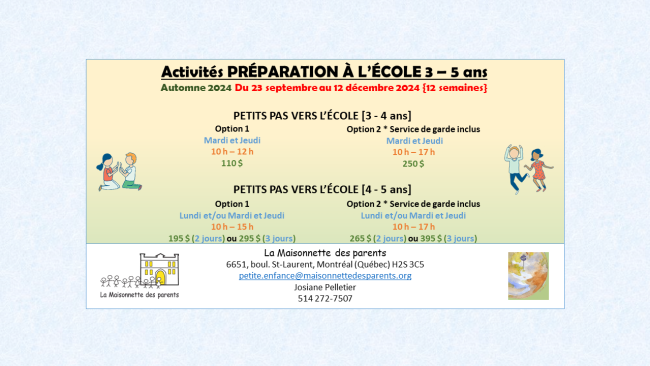 Nous avons le plaisir de vous présenter notre programmation d’activités pour la session d’automne ! 🙂   Notre Session Automne 2024 va débuter la semaine du 23 septembre prochain. À noter que ladite session est de 10 semaines, pour la majorité des activités, et que les tarifs ont été ajustés en conséquence. Vous constaterez qu’il y…