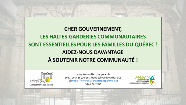 La Maisonnette des parents est un organisme communautaire Famille qui est fier de pouvoir offrir une variété de services à sa communauté, dont un service de halte-garderie essentiel, et ce, tout au long de l’année ! 🙂 Nous nous joignons donc fièrement au mouvement, orchestré par l’Association des haltes-garderies communautaires du Québec (AHGCQ) et ses…
