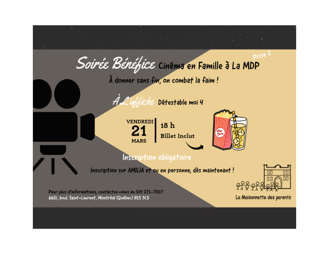 C’est avec beaucoup d’enthousiasme que La Maisonnette des parents annonce une 2e édition de sa Soirée bénéfice – Cinéma en famille à La MDP ! 🙂 C’est donc un rendez-vous dans nos locaux, le vendredi 21 mars prochain, à 18 h ! Venez clôturer votre semaine en visionnant une comédie familiale : « DÉTESTABLE MOI 4…