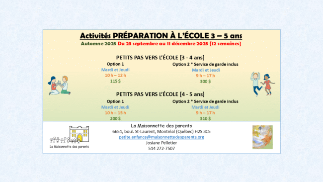 Nous avons le plaisir de vous présenter notre programmation d’activités pour la session d’automne ! 🙂   Veuillez cliquer sur le bouton ci-dessous :   Notre Session Automne 2025 va débuter la semaine du 22 septembre prochain. 🙂 À noter que ladite session est de 10 semaines, pour la majorité des activités, et que les tarifs…