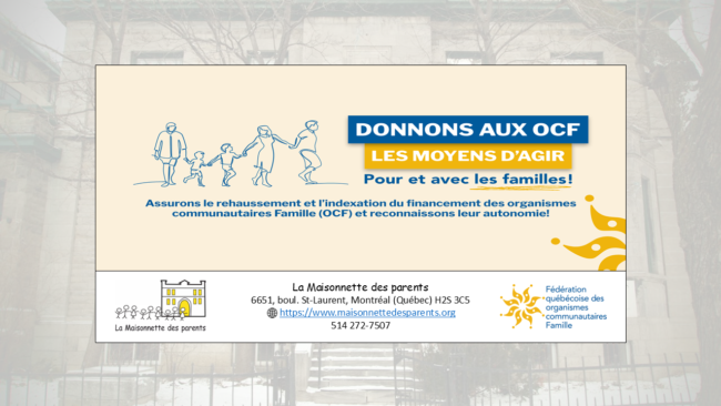 La Maisonnette des parents est un organisme communautaire Famille (OCF) qui est fier de pouvoir offrir une variété de services à sa communauté, et ce, tout au long de l’année ! 🙂 C’est donc avec solidarité et ténacité que nous nous joignons à la campagne de mobilisation orchestrée par la Fédération québécoise des organismes communautaires…