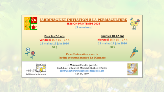 Avec le retour du printemps, La Maisonnette des parents est fière de vous annoncer le retour de ses ateliers de jardinage avec notre cher Stéphanouille ! 🙂 Les ateliers seront offerts selon deux groupes d’âge, soit pour les 7-9 ans et les 10-12 ans. Ils s’étaleront sur cinq semaines ; du 13 mai au 19…