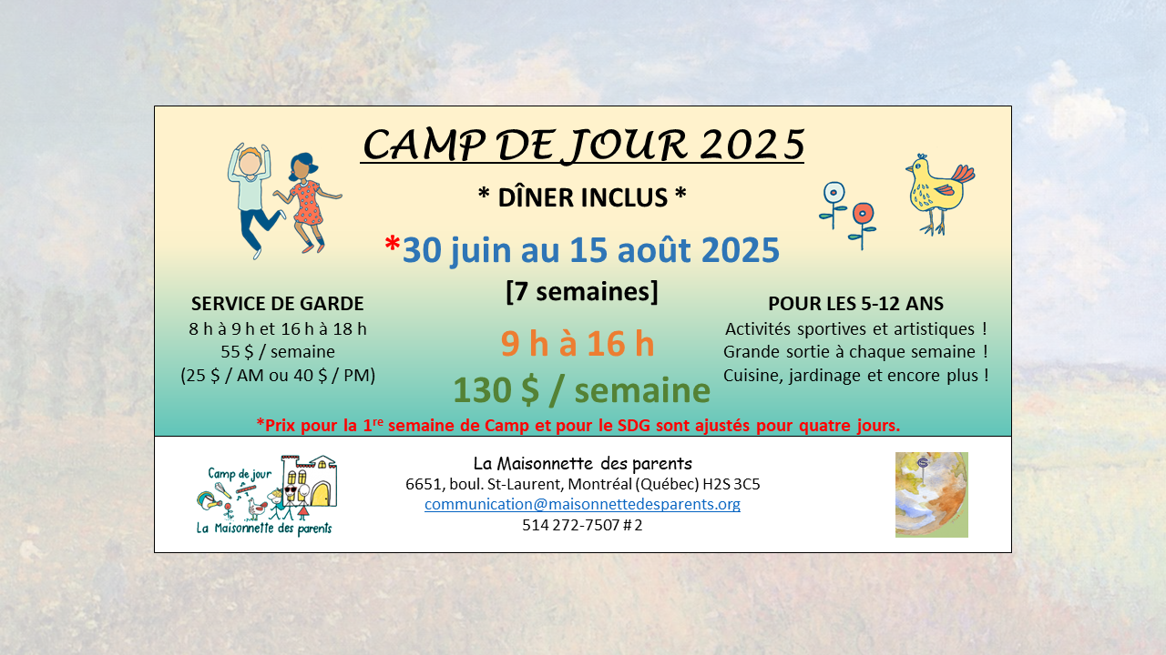 Du 30 juin *[mardi 1er juillet exclu ; Jour Férié] au 15 août 2025, La Maisonnette des parents offre à vos enfants âgés entre 5 et 12 ans des vacances hors de l’ordinaire en les initiant, entre autres, à la cuisine, au jardinage, à la musique et à une variété d’activités physiques et artistiques ! Durant leur séjour, nous encourageons vos enfants à adopter de saines habitudes de vie tout en étant responsables en matière d’environnement ! Un service de garde sera disponible pour la totalité du camp ! Les grandes sorties seront de retour, donc il y aura une activité spéciale/grande sortie par semaine à chaque jeudi, en plus des petites sorties dans le quartier et les environs. 🙂