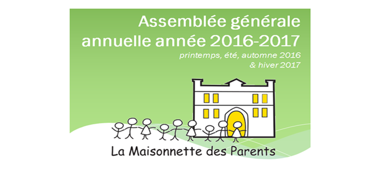 Le conseil d’Administration de la Maisonnette des parents invite ses membres à son assemblée générale annuelle, le lundi 12 juin 2017 à 19h00.