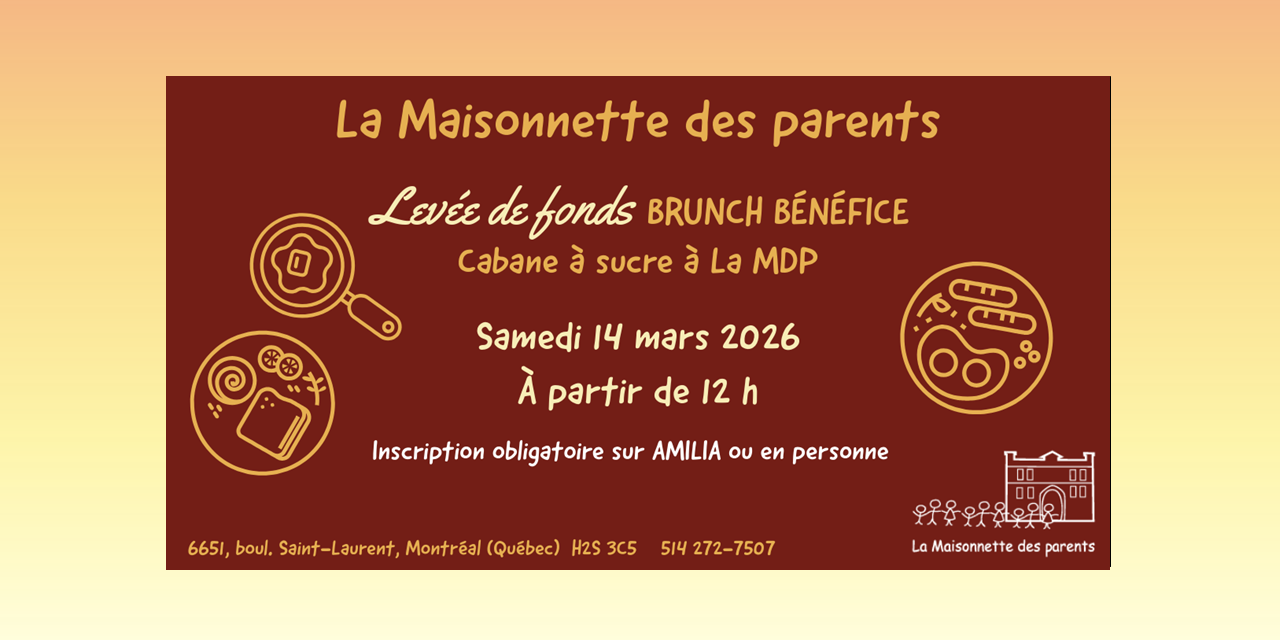 C’est avec beaucoup d’enthousiasme que La Maisonnette des parents organise un brunch bénéfice dans ses locaux, le samedi 14 mars prochain, à 12 h (midi) ! 🙂