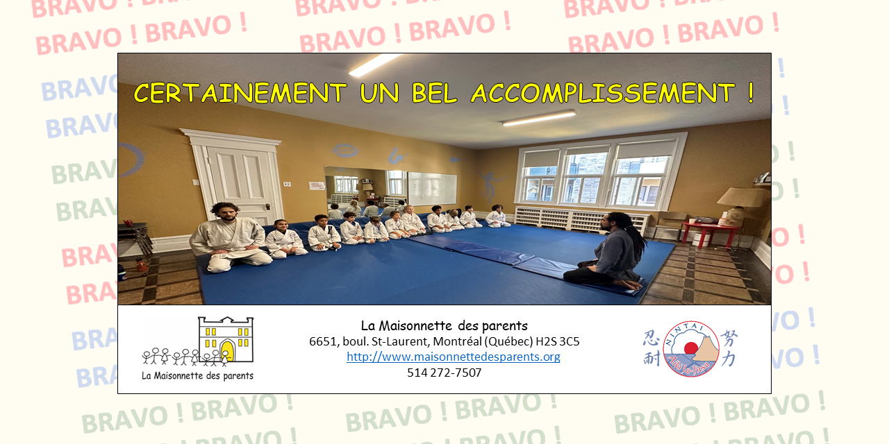 La Maisonnette des parents est très fière de souligner la persévérance de nos jeunes qui participent à notre activité d’arts martiaux Nintai Aiki Ju-Jitsu ! 🙂 D’ailleurs, le mot Nintai signifie persévérance en japonais, et en voici la preuve !