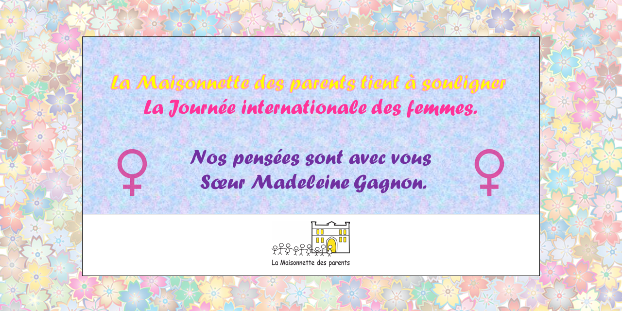 Dans le cadre de la Journée internationale des femmes, La Maisonnette des parents tient à saluer l’effort de toutes ces femmes qui se sont dévouées pour une cause, et particulièrement, notre fondatrice Sœur Madeleine Gagnon. 🙂
