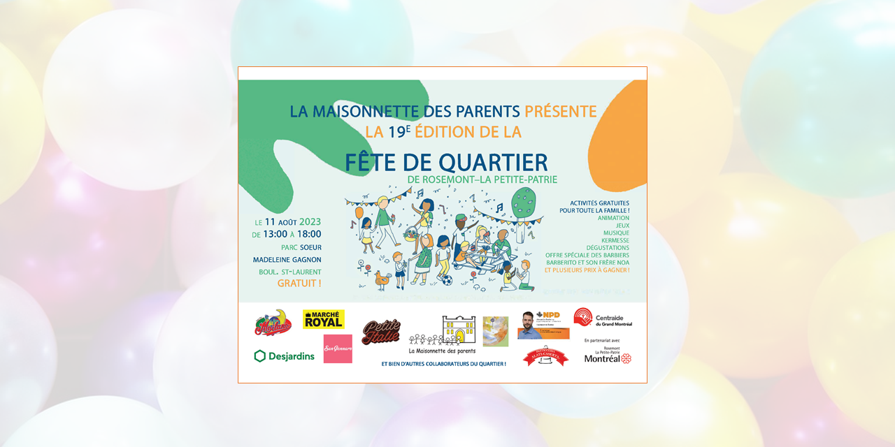 C’est avec grand plaisir que nous annonçons le retour de la traditionnelle Fête de quartier de La Maisonnette des parents ! 🙂 L’événement aura lieu ce vendredi, le 11 août, de 13 h à 18 h, dans le parc collé à notre organisme qui avait été renommé en l’honneur de notre chère fondatrice. 🙂 Nous revenons à notre bonne vieille formule puisque la Fête se déroulera pendant la période où notre Camp de jour 5-12 ans est toujours en cours !