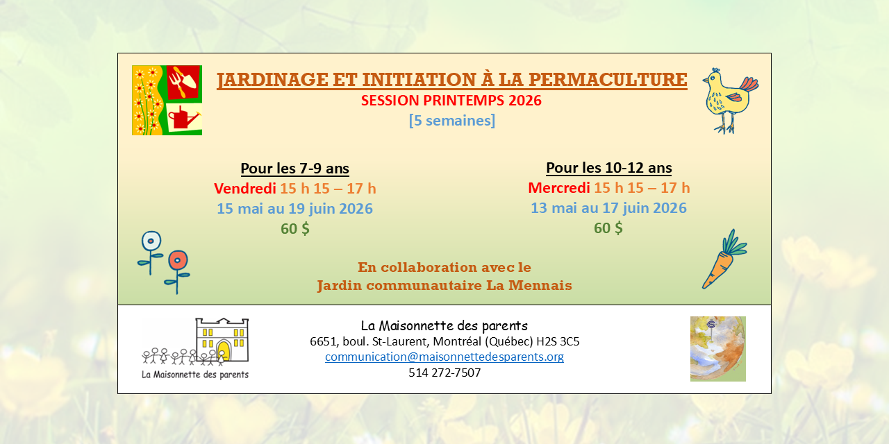Grâce à notre partenariat avec l’École La Petite-Patrie, l’activité « Jardinage et Initiation à la Permaculture », débutant à 15 h 45, incluent l’accompagnement de votre enfant, à partir de 15 h 15, de l’École La Petite-Patrie jusqu’au Jardin communautaire La Mennais ou à La Maisonnette des parents. 🙂 Vous n’aurez qu`à venir récupérer votre enfant à 17 h, et ce, à l’emplacement mentionné dans la communication que vous recevrez, donc soit au jardin en question ou à notre organisme. Un rappel que les horaires de nos activités pour les enfants 5-12 ans, celles débutant à 15 h 45 précisément, ont été programmés en fonction des journées pédagogiques du calendrier scolaire de ladite école.