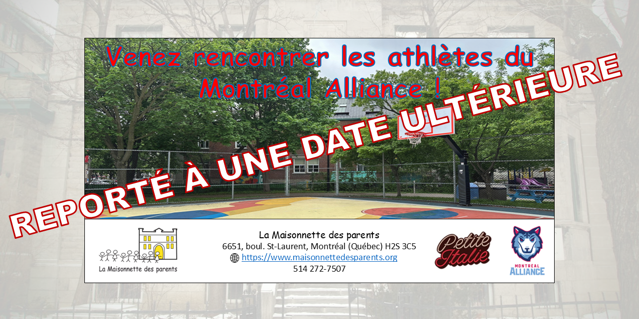 Dans le cadre d’une cérémonie symbolique de changement de filets, c’est avec enthousiasme que La Maisonnette des parents annonce la belle visite de l’Équipe de basketball professionnelle de Montréal, et ce, grâce à notre cher partenaire SDC Petite Italie. 🙂